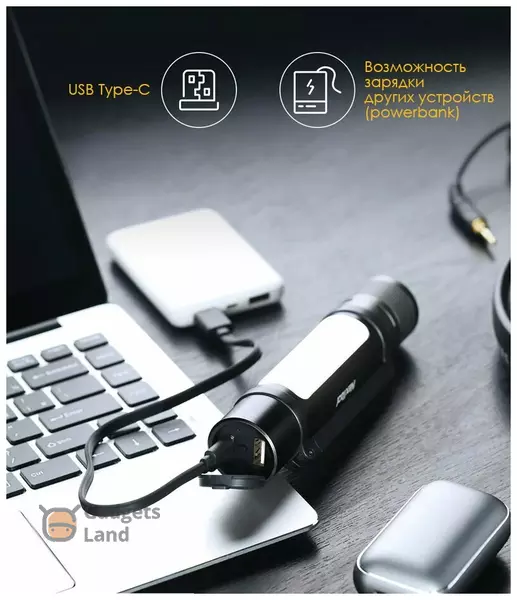 Функции: фокусировка луча, встроенный магнит, боковой свет с вращением 360°, динамик, синхронизация ритма и света, белый свет, сигнальный красный свет, постоянный красный свет, звуковая и световая сигнализация, функция PowerBank, возможность установки на штатив